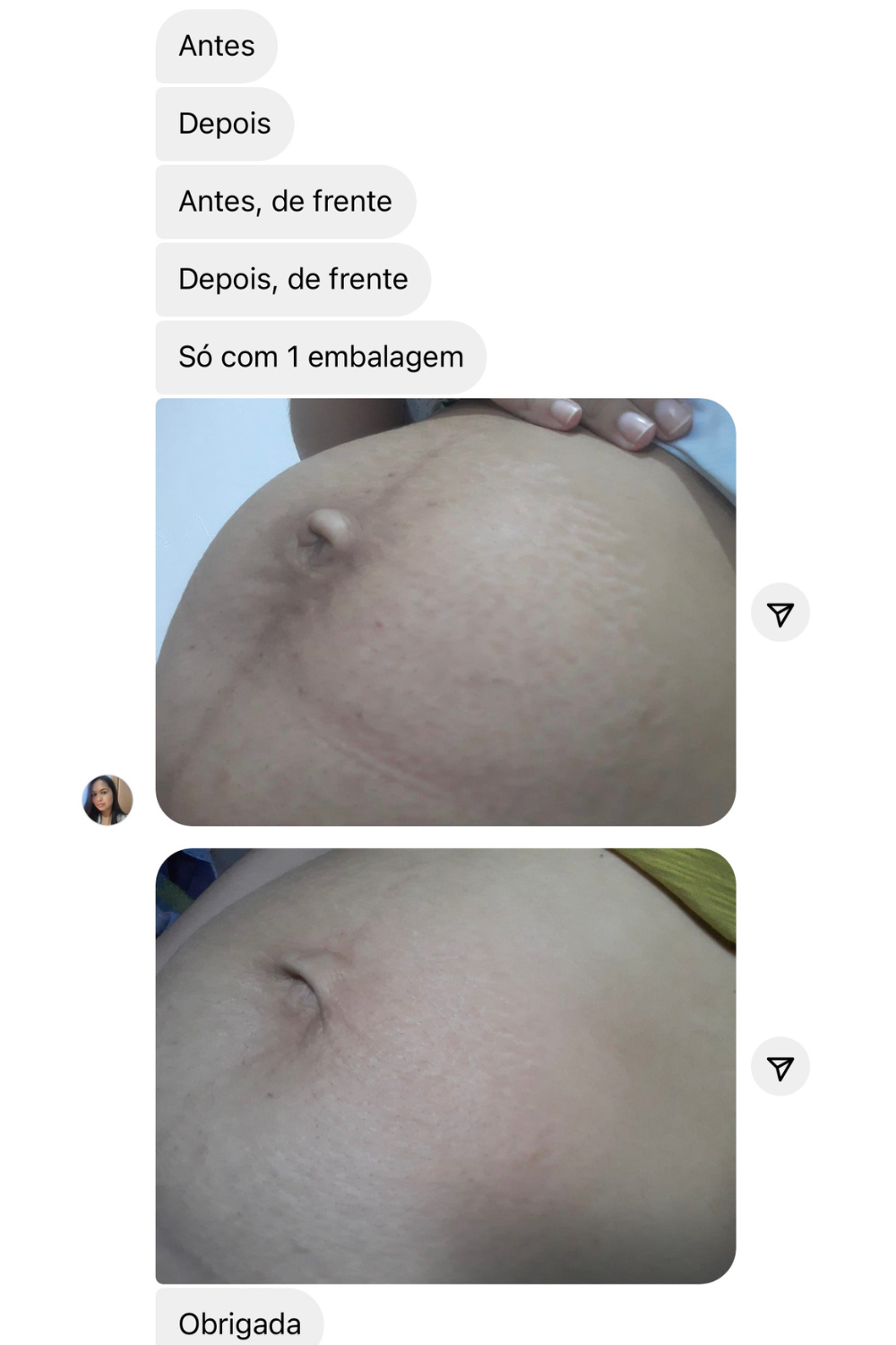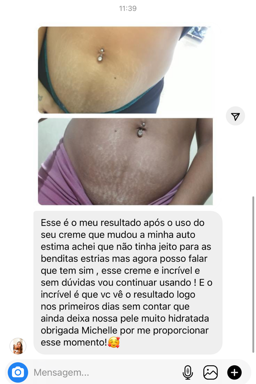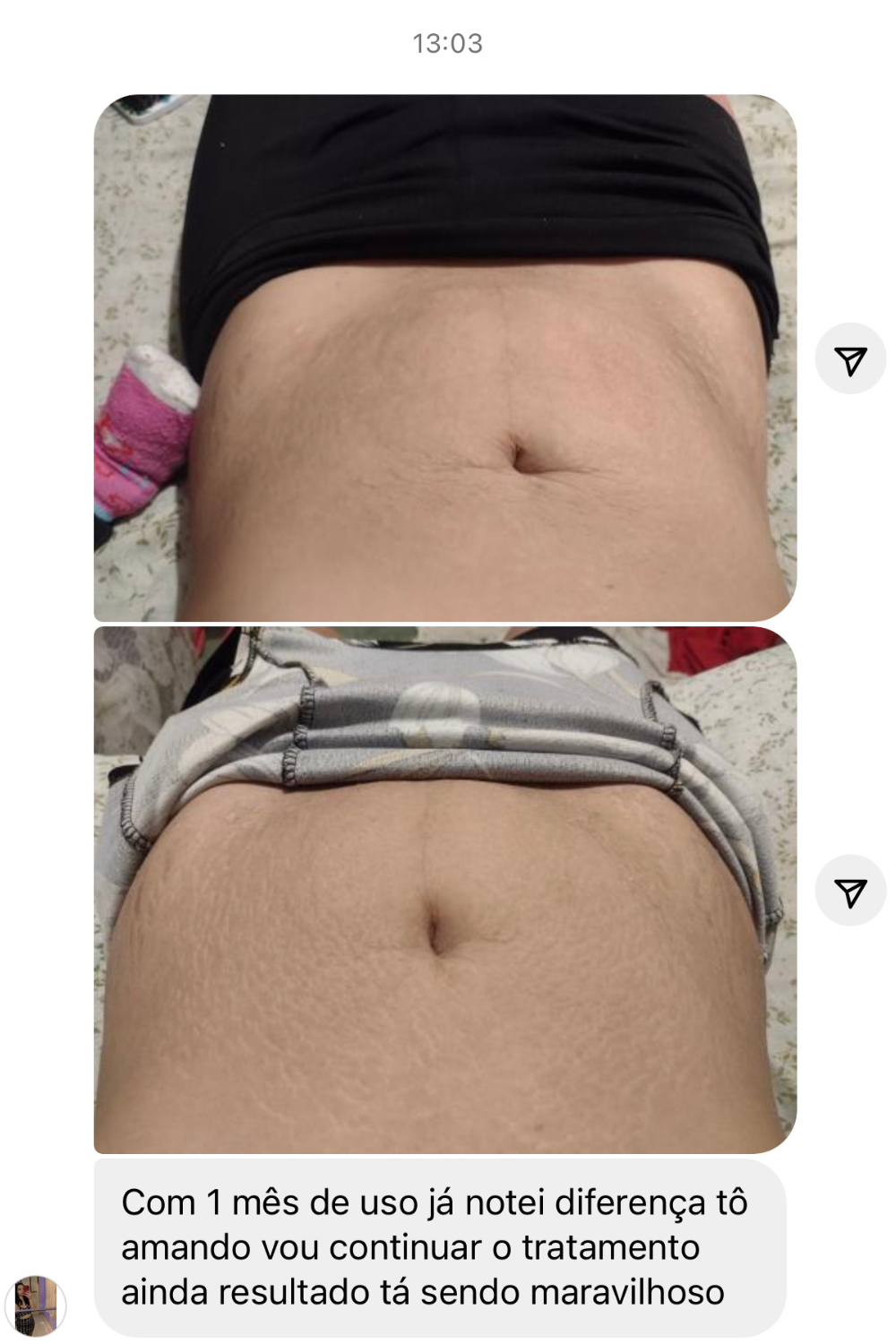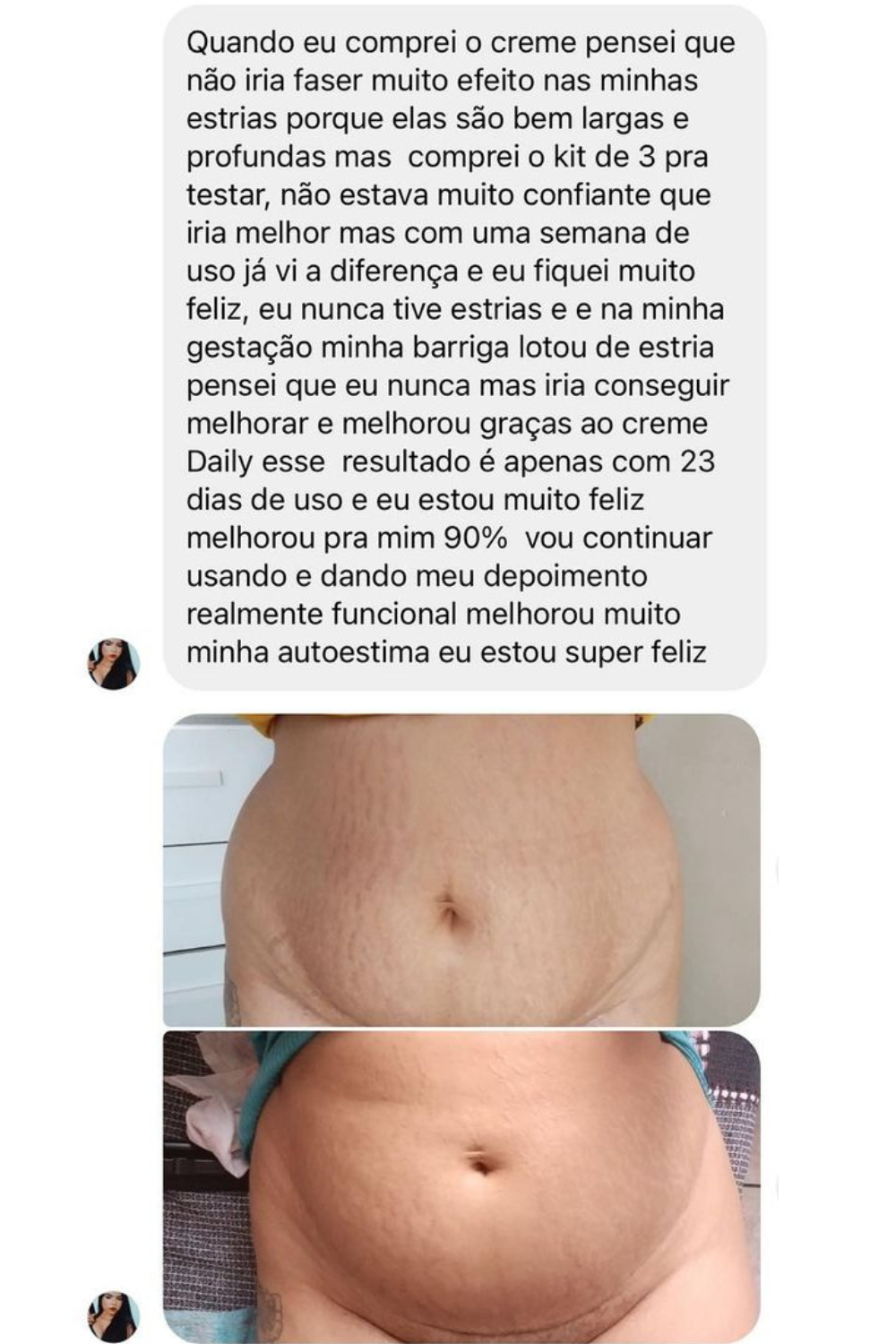 Nosso creme para estrias é aprovado pela Anvisa e tem eficácia clínica comprovada. Em um estudo realizado por dois médicos ao longo de 120 dias com 80 mulheres, observou-se uma média de 80% de melhora na aparência de estrias de médio a fino calibre — independentemente da cor. A eficácia pode variar em peles com flacidez mais acentuada.