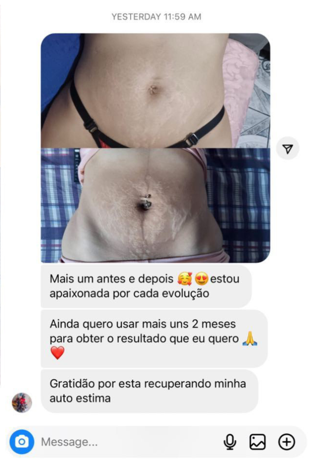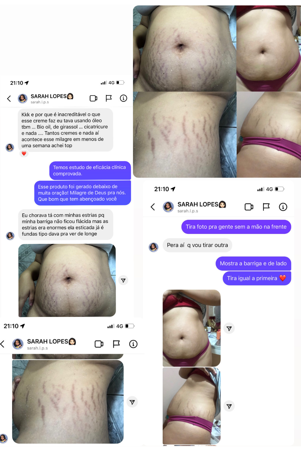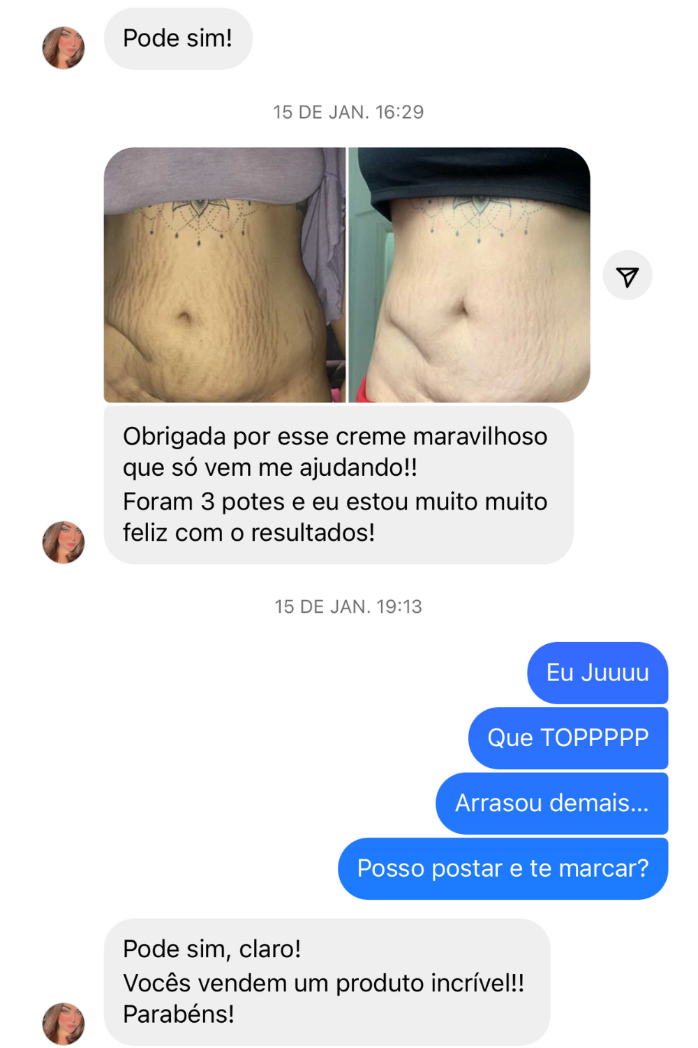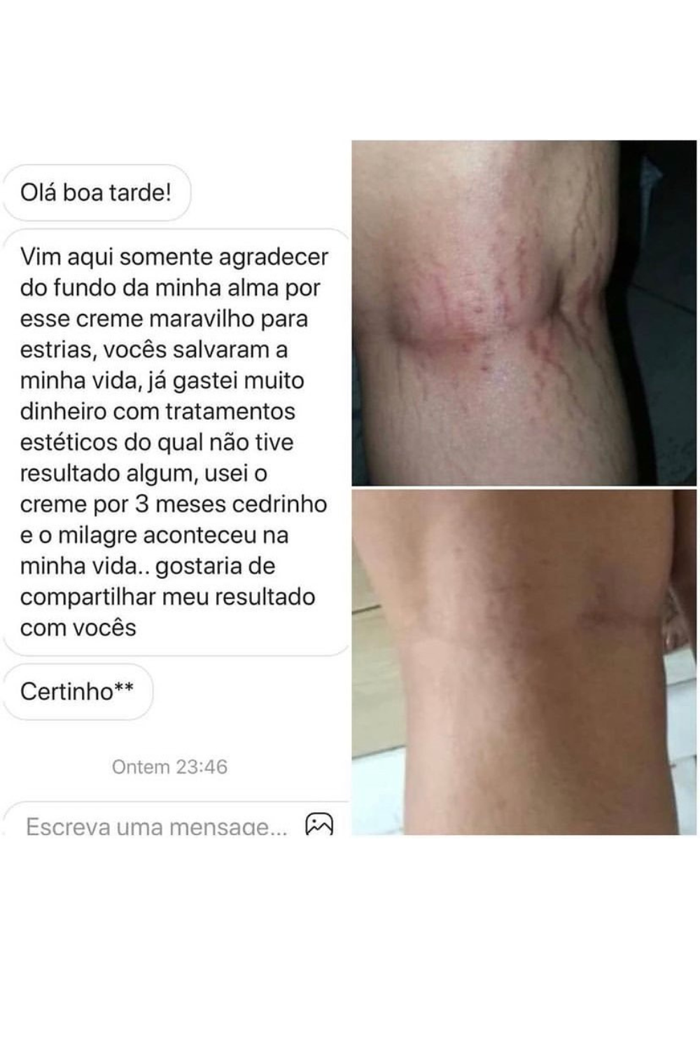Nosso creme para estrias é aprovado pela Anvisa e tem eficácia clínica comprovada. Em um estudo realizado por dois médicos ao longo de 120 dias com 80 mulheres, observou-se uma média de 80% de melhora na aparência de estrias de médio a fino calibre — independentemente da cor. A eficácia pode variar em peles com flacidez mais acentuada.